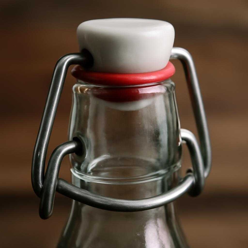 Основой запорного узла служит прочная проволочная скоба, согнутая в форме П-образной рамки. Гибкость стали распределяет нагрузку равномерно, резиновая прокладка прижимается к кромке горла без повреждения стекла. При нажатии рычаг образует дополнительный момент, поэтому давление внутри емкости поднимается до 4–5 бар без утечек. Подобная прочность ценится при розливе молодых игристых вин или сидра.