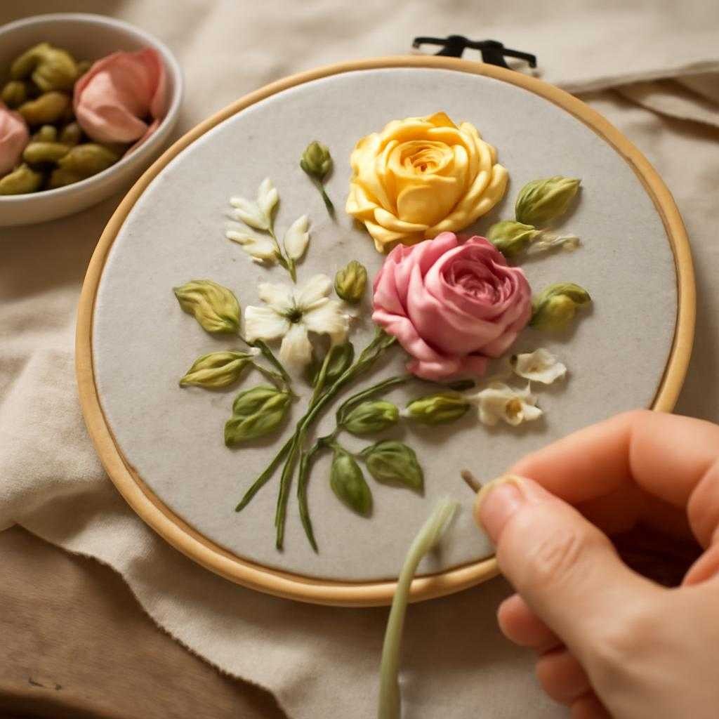 На тренировочной салфетке размечаю лёгким карандашом окружность диаметром 7 см — будущая розетка. Центр закрывается пятью витками «рококо» светло-персикового оттенка. Следующий круг строится ленточными нитками шириной 12 мм, с плавным увеличением длины. Листья выходят прямым стежком зелёной репсовой лентой 6 мм. После завершения поверхность слегка пропаривается через марлю, пар фиксирует изгибы без прилипания.