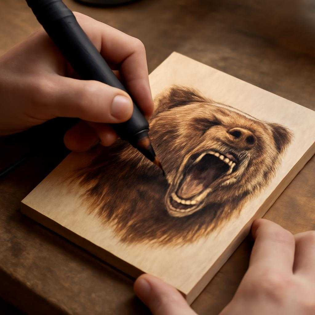 Современный аппарат напоминает паяльник с регулятором до 1050 °C. Насадки из нихрома передают тепло быстрее, жало из вольфрама — точнее. Для сграффито-эффекта применяю «шумперк» — тончайшее перо толщиной 0,1 мм. Температура задаёт оттенок: при 350 °C линия янтарная, при 650 °C уже почти антрацитовая. Шаговое прогревание исключает грат, а предварительное шлифование зерном P400 убирает «ворс», препятствующий ровному следу.