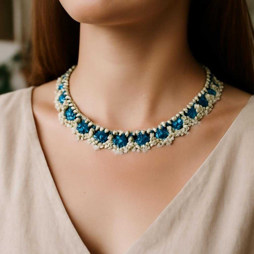 Для кружевного колье подойдёт бисерная сетка. Сначала собираю базовую цепочку, затем вывожу ячейки одинакового шага. На узлах сетки размещаю акцентные бусины, капли, кристаллы или жемчуг. Здесь полезен термин «раппорт» — повторяющийся фрагмент узора. Когда раппорт просчитан заранее, полотно выходит симметричным, а расход материалов предсказуемым. Сетка любит точность, одна лишняя бисерина в ячейке меняет угол натяжения и ломает стройность линии. Зато при верной сборке она ведёт себя как морозный узор на стекле: хрупкий вид сочетается с продуманной структурой.