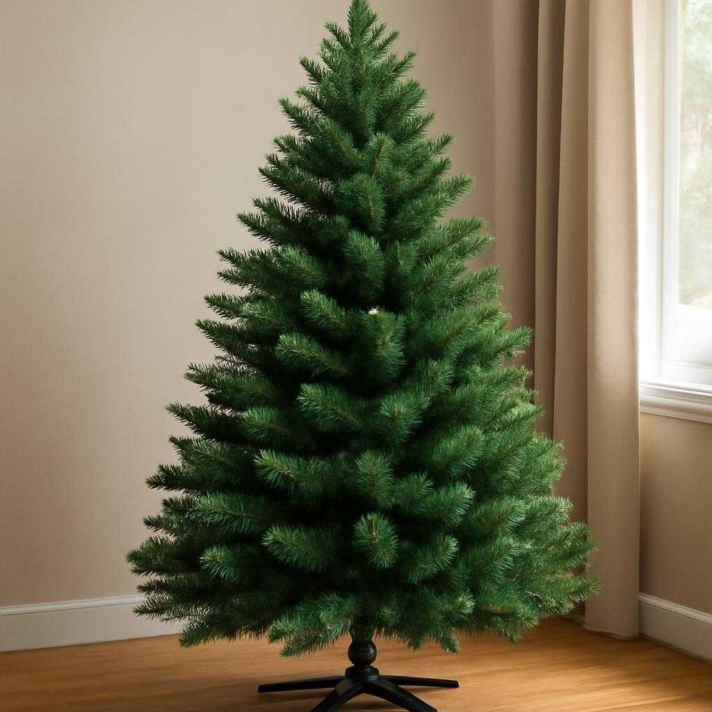 Сначала я смотрю на материал хвои. Литые ветки выглядят реалистичнее, держат форму дольше и обычно служат дольше. Их делают плотнее, иголки у них объемные, с заметной фактурой. Пленочная хвоя проще и дешевле, ветки у нее мягче, внешний вид скромнее. Комбинированные модели дают разумный баланс: наружные ветки литые, внутренние — из пленки. За счет этого дерево выглядит гуще без резкого роста цены.