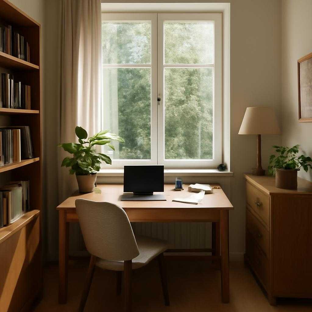 Текстиль добавляет уюта, а живые растения усиливают ощущение приватности. Изображения спокойных ландшафтов или абстракций уместны на стенах при умеренной насыщенности цвета.